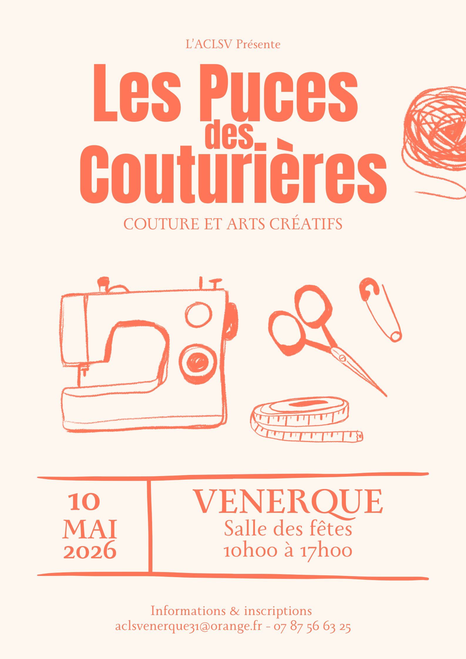 La 9ième édition des Puces des couturières se tiendra le Dimanche 10 Mai 2026 à la salle des fêtes de Venerque de 10h à 17h. Que vous soyez débutant(e) ou confirmé(e), vene