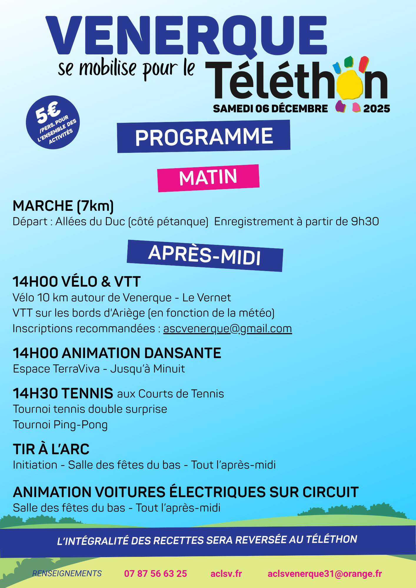 L’ACLSV organise avec plusieurs associations de Venerque le 5 ième du téléthon. Cette année, nous vous proposons une marche (7 Kms) le matin, initiation au tir à l&rsquo